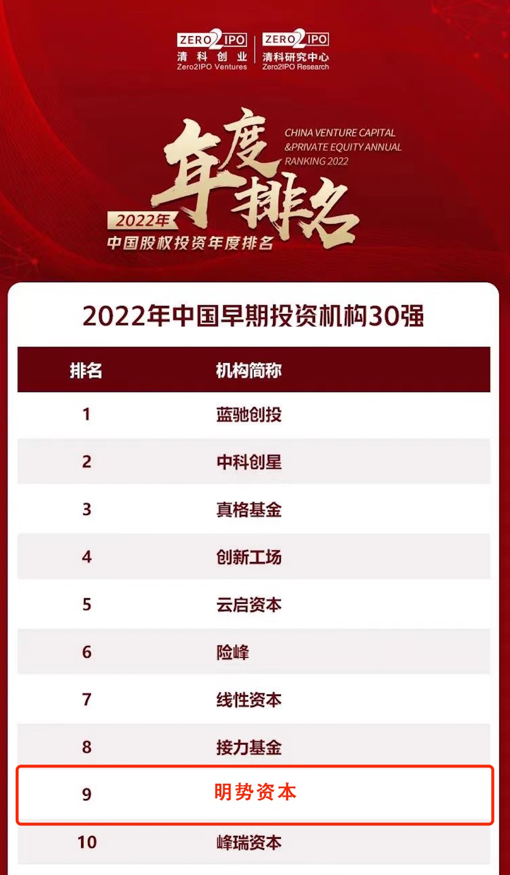 12月23日,由清科创业、投资界主办的第22届中国股权投资年度论坛上,发布了「2022年中国股权投资年度排名」。明势资本入选「2022年中国早期投资机构30强」并且排名第9,同时明势资本创始合伙人黄明明荣获「2022年中国早期投资家10强」。