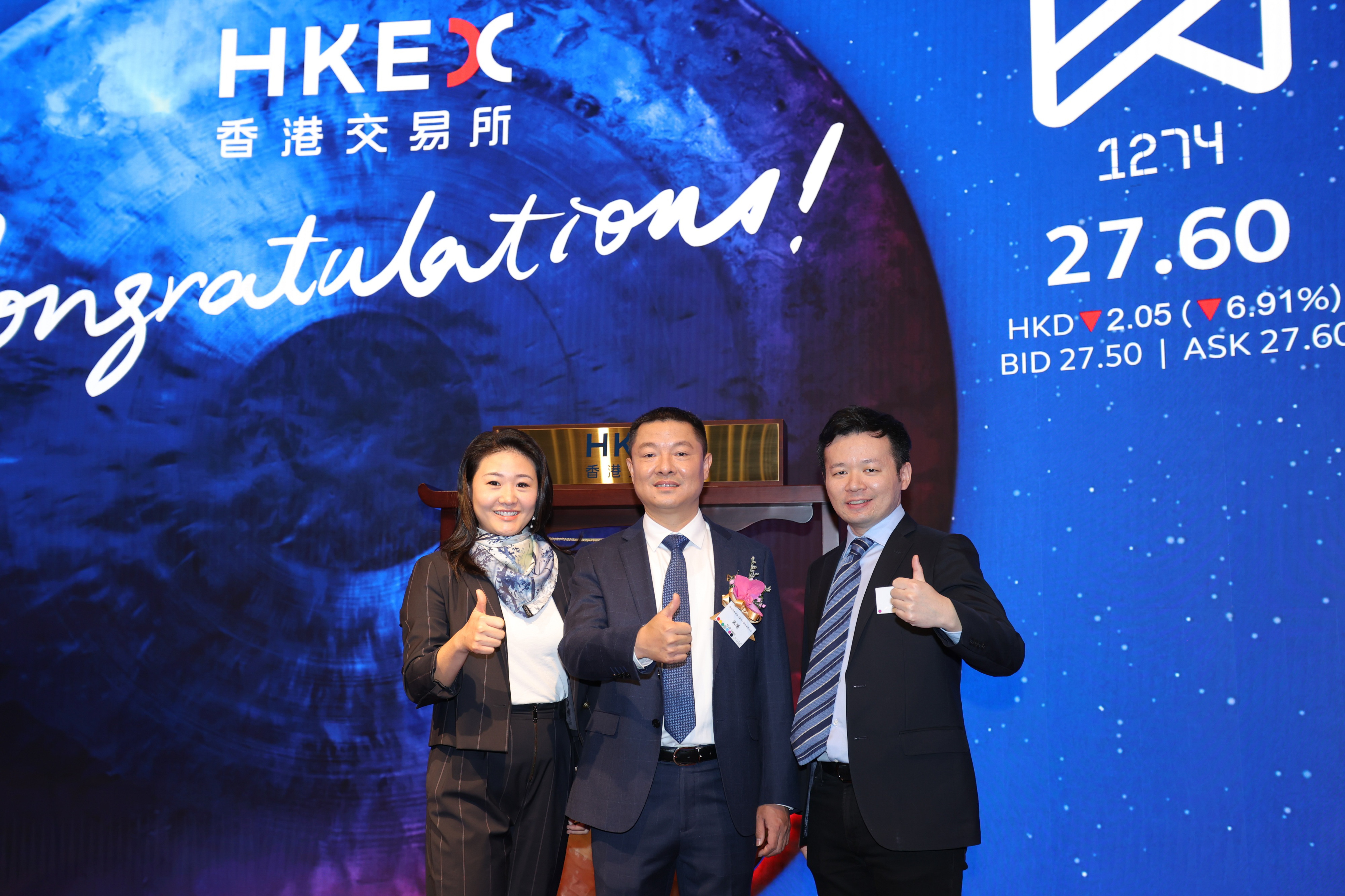知行科技创始人、董事长兼CEO宋阳(中)与明势资本合伙人夏令(右)、明势资本董事总经理杨慕融与在知行科技港交所主板上市仪式上